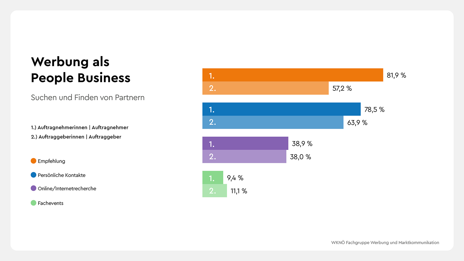 Empfehlungen und persönliche Kontakte bleiben für die Partnersuche am relevantesten. Neben diesen Vertrauenskriterien sticht das Preisniveau der Auftragnehmerinnen und Auftragnehmer hervor. Erwähnenswert ist jedoch, dass – der Pandemie zum Trotz – Fachevents auf beiden Seiten noch immer relevant sind.