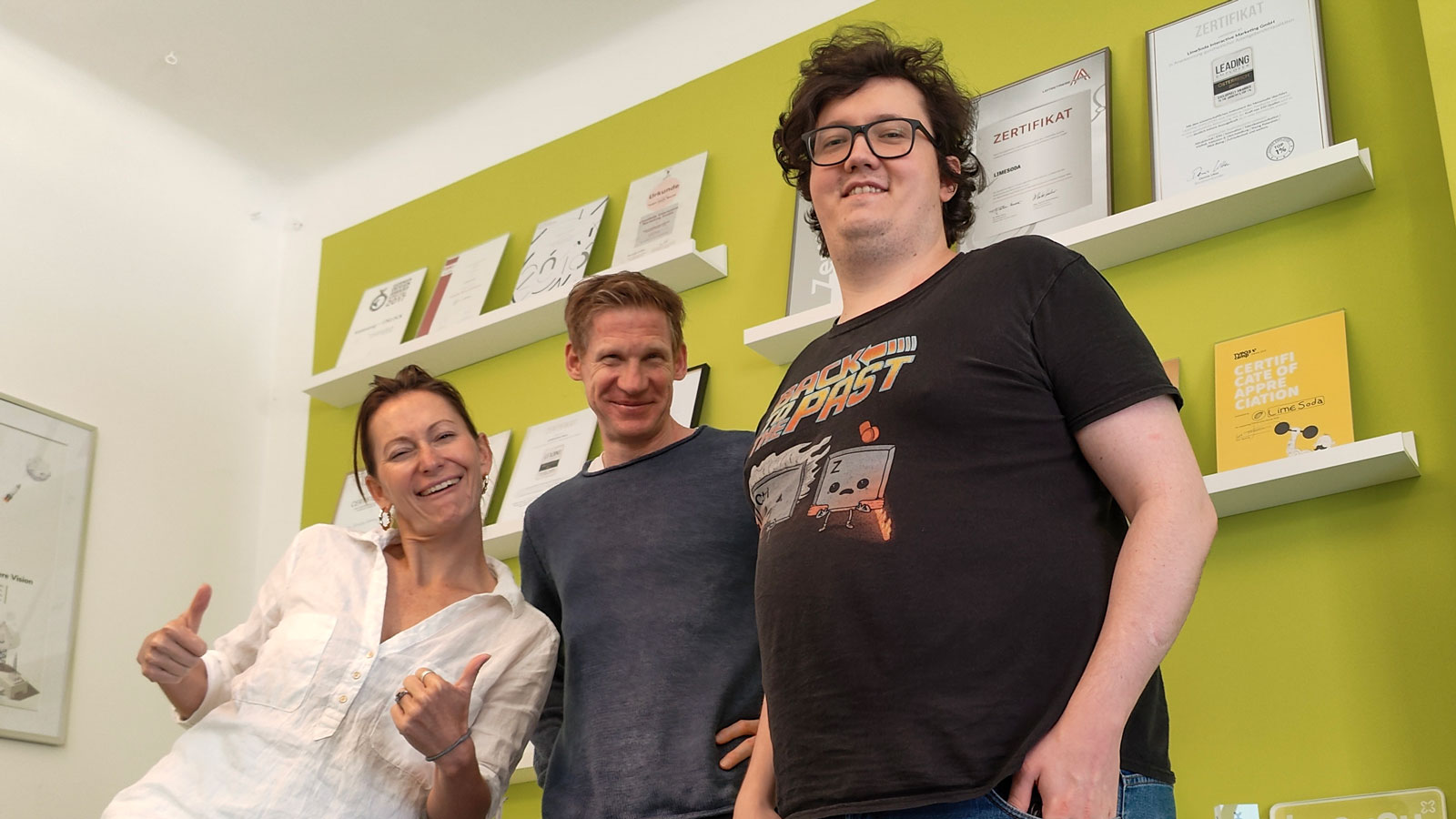 Lehrling Zuzanna Hölzl, Geschäftsführer Philipp Pfaller und Michael Hafenscher, der bereits ausgelernt ist und jetzt bei LIMESODA arbeitet (v. l.)