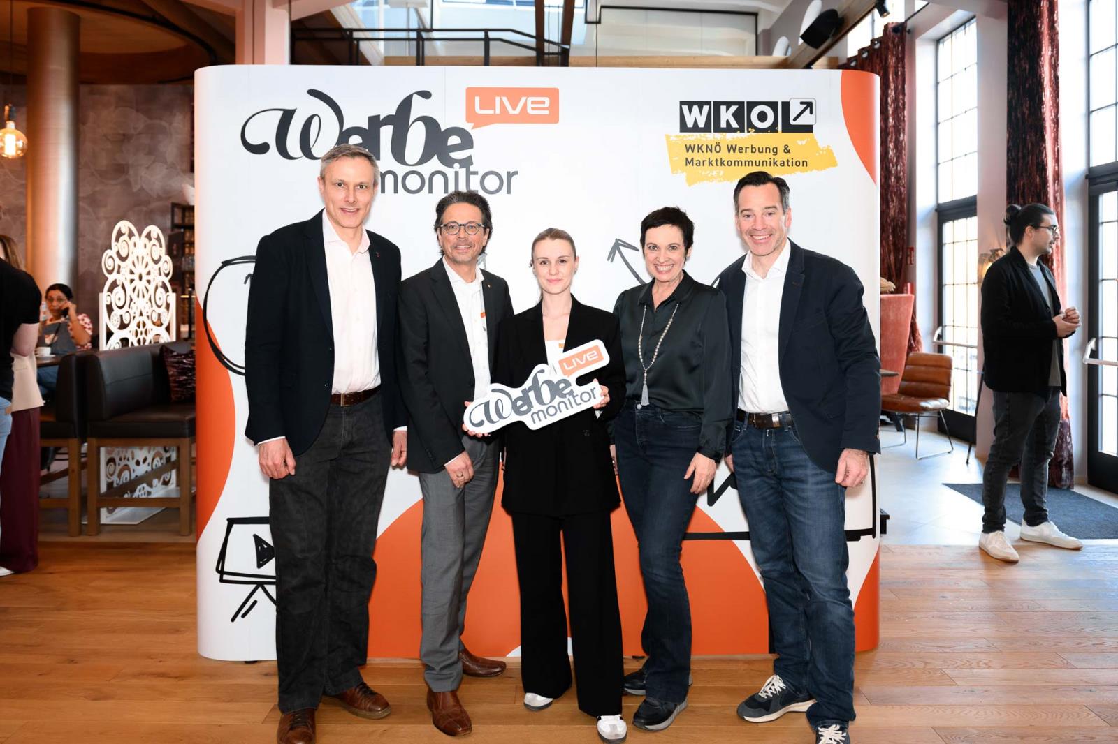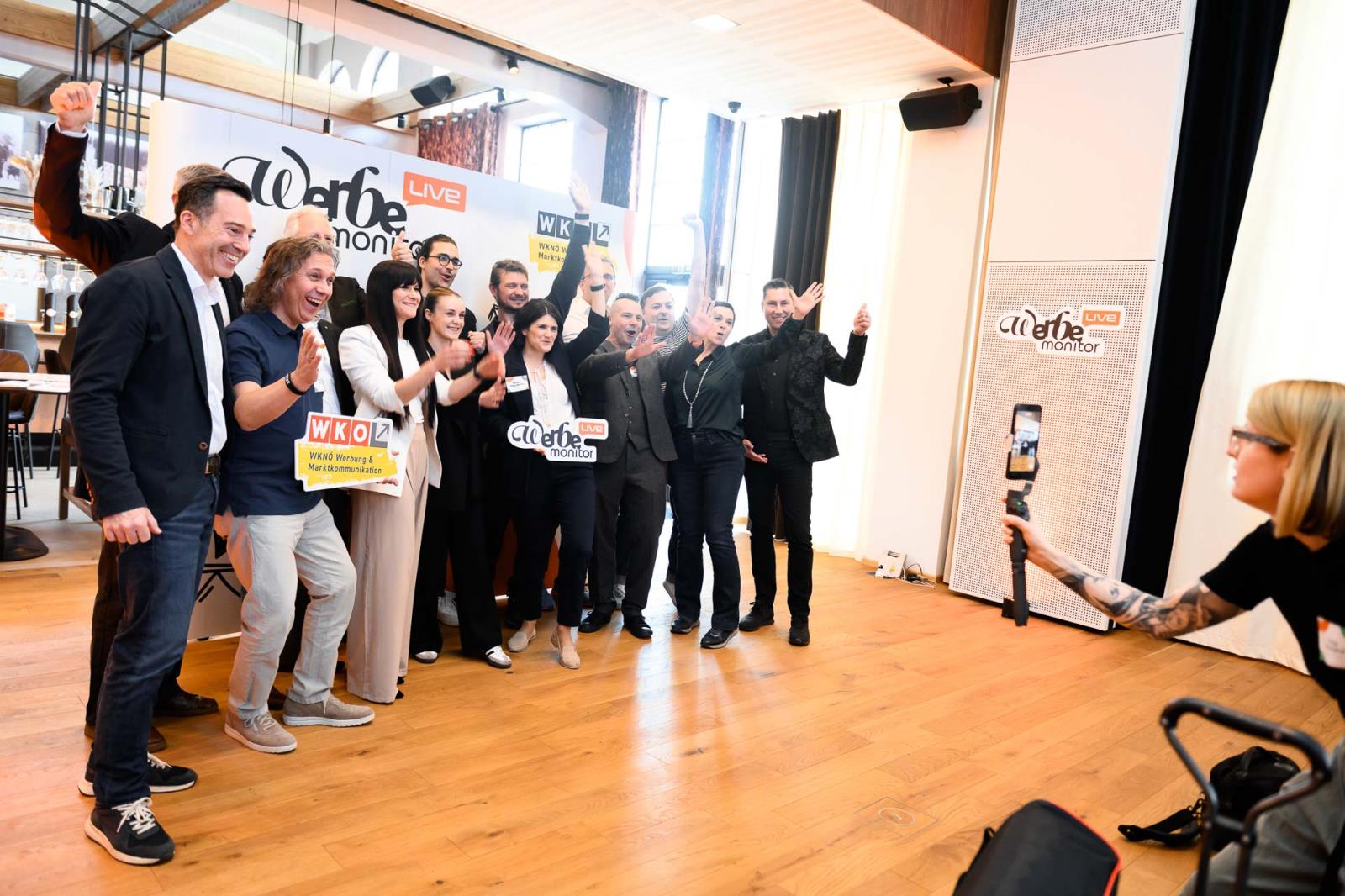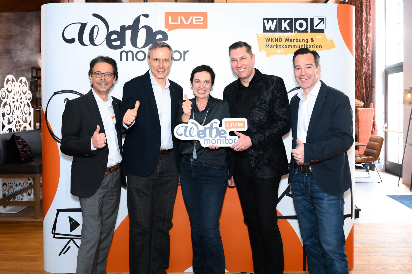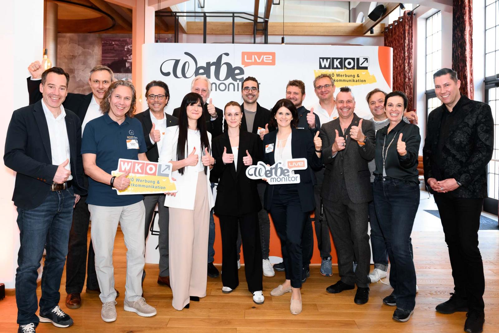 Werbemonitor LIVE, ein Format zugeschnitten auf die Werbe- und Kommunikationsbranche mit: Fachgruppenobmann Andreas Kirnberger, Fachgruppengeschäftsführer Clemens Grießenberger, Ausschuss-Mitglied Andreas Roffeis, Fachgruppenobmann-Stv. Timm Uthe, Julia Lipp, Ausschuss-Mitglied Herbert Sojak, Vanessa Wurster, Sebastian Podesser, Kerstin Oberzaucher, Ausschuss-Mitglied Bernhard Dockner, Marco Lumsden, Max Niederschick, Richard Weiretmayr, Werbemonitor-Chefredaktion Sabine Wolfram und Fachverbandsobmann Jürgen Bauer (v. l.)