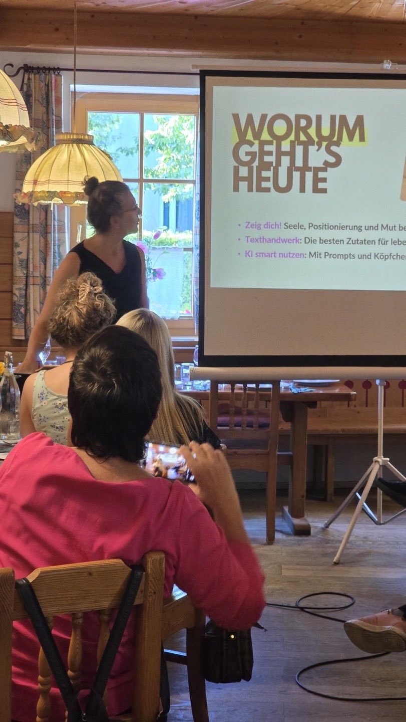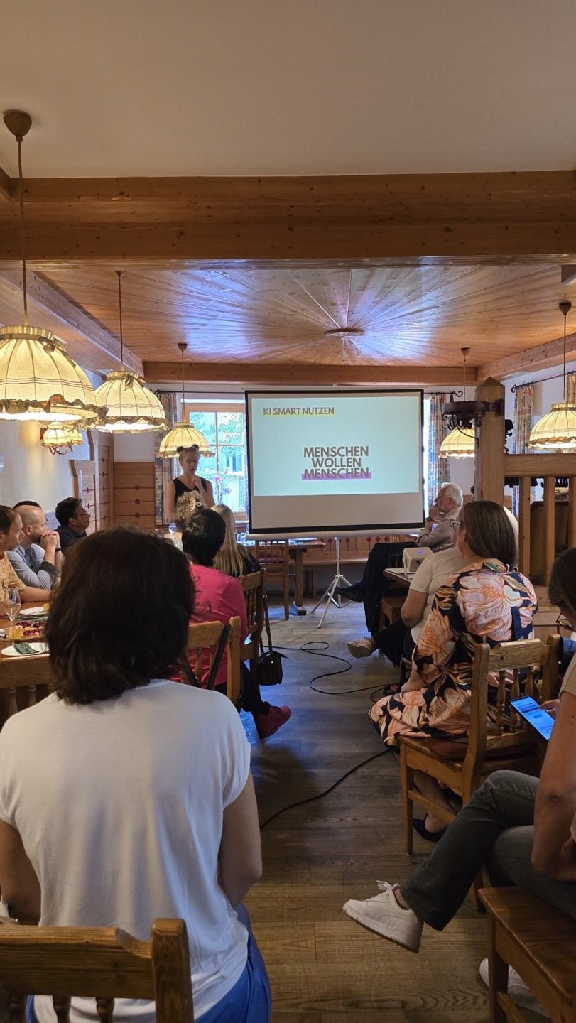 Bettina Benesch nahm uns anschließend mit in die Welt der Worte und sprach über „Texte mit Seele – für Leute mit Köpfchen“. KI könne ganz gute Texte schreiben, so der Tenor der Texterin, doch wirklich lebendig werden sie erst, wenn sie die Persönlichkeit des Menschen dahinter tragen. Bettina zeigte, wie einfache Regeln helfen, Klarheit und Struktur in Texte zu bringen. Den entscheidenden Unterschied aber macht die Markenpersönlichkeit: der eigene Ausdruck, die Einzigartigkeit, das Herz. KI kann hier zwar assistieren, ersetzen kann sie die persönliche Note aber nicht. Zudem gab es viele Tipps, wie KI smart genutzt werden kann – mit allen Vor- und Nachteilen.