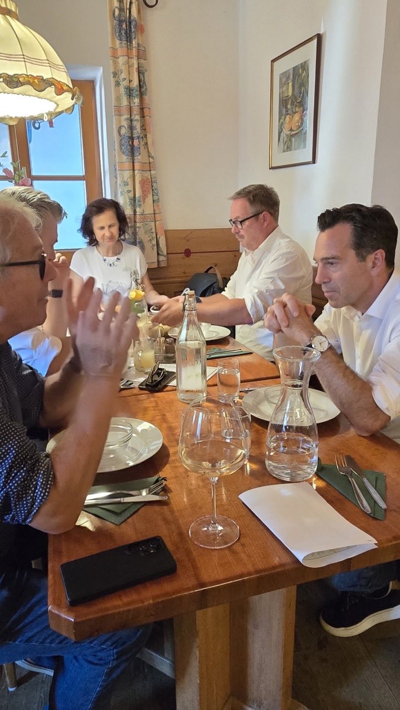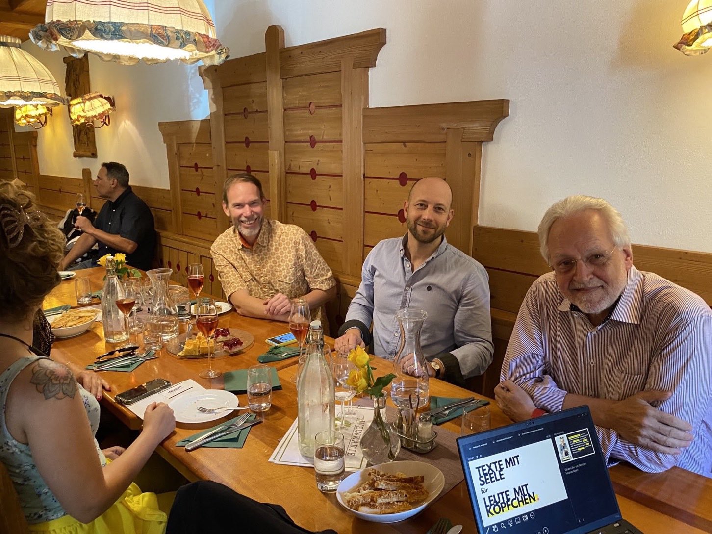 Und weil gute Gespräche bekanntlich am besten bei gutem Essen gelingen, kredenzte uns danach das Heurigenteam köstliche Schmankerl und ein gutes Glas Wein. Es wurde geplaudert, gelacht und so manch neuer Kontakt geknüpft. Ein großes Dankeschön geht an Andreas Roffeis für die perfekte Organisation (außerdem gelang ihm das Kunststück, auf keinem einzigen Foto zu landen!).